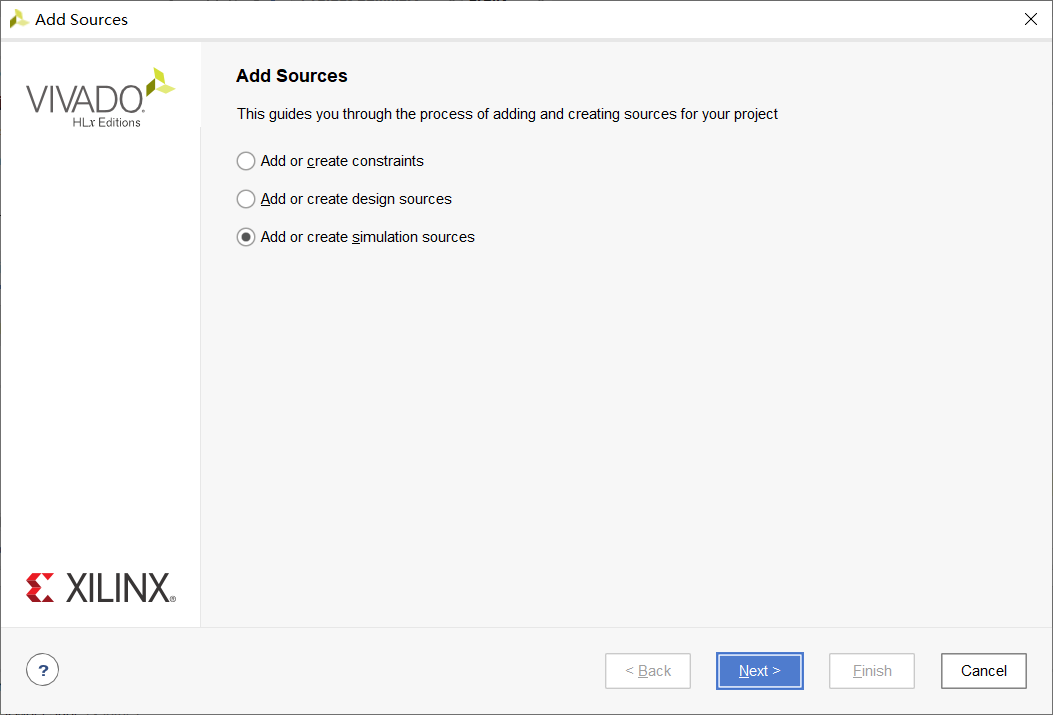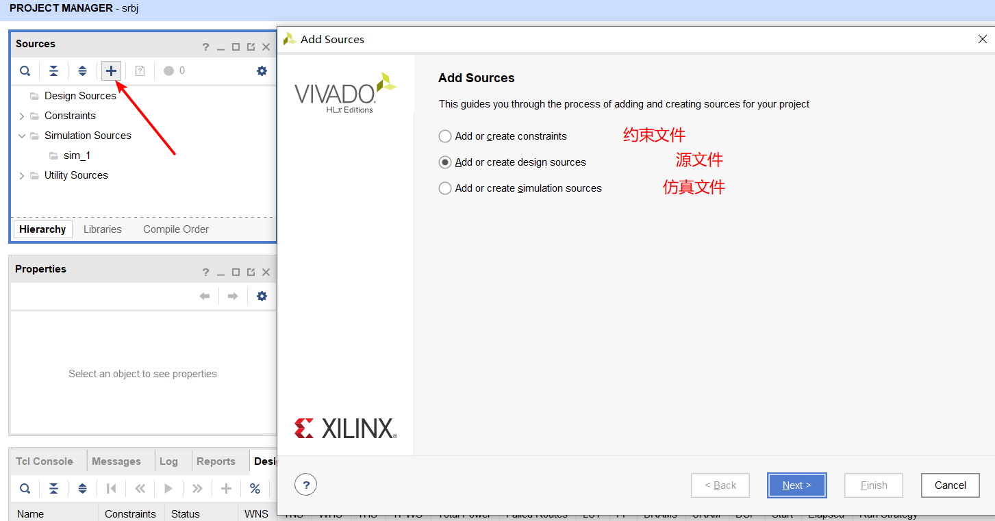 在source面板中点击加号,如图右半部分可以新建三种文件,即约束文件、源(设计)文件、仿真文件,这里首先新建源文件即可。