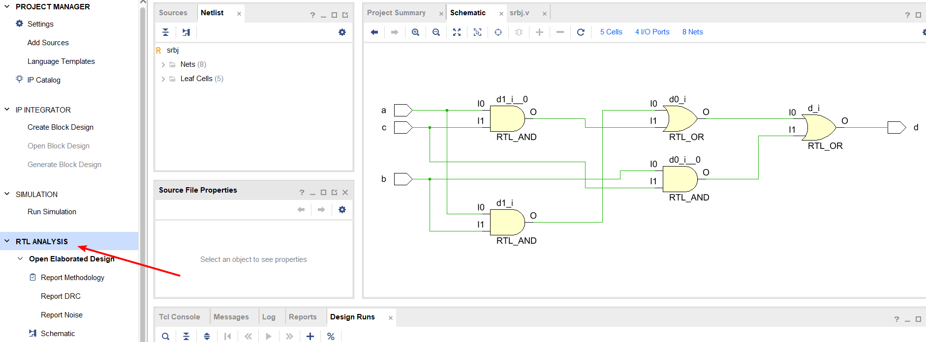点击左侧的RTL ANALYSIS可以生成相关的逻辑图,检查逻辑是否有问题